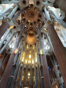 Bereits das Design des Gebäudes in der Form eines klassischen Langkreuzes, als Symbol des christlichen Glaubens, ist Programm. Durch die Aufteilung des Raumes in fünf Schiffe vermittelt er den Eindruck immenser Größe und Weite. Die Gewölbe und die sie tragenden Säulen der Sagrada Familia suggerieren etwas Lebendiges und bei längerem Betrachten erweitert sich die Architektur zu einem majestätischen Naturphänomen, ja, man hat den Eindruck sich in einem lichten Wald aus Palmen zu befinden. Die geneigten Säulen verzweigen sich nach oben wo sie eine Art von Geflecht aus Palmwedeln bilden. Bei genauem Hinsehen sieht man, dass die Säulen aus ganz unterschiedlichen Materialien bestehen: Ich erkenne Granit, Porphyr und auch den klassischen Basalt. Die einzigartige Formensprache Gaudís in diesem Kirchenschiff wird ergänzt durch die grandiose Lichtführung im gesamten Bau. Das Spiel der Farben der bunten Glasfenster im steinernen Palmenhain scheint so surreal, dass man glauben könnte, hier seien spirituelle Kräfte am Werk. Ich konnte mich dieser Atmosphäre, der zweifelsohne etwas Transzendentales innewohnte, nicht entziehen und habe mich auf einer Kirchenbank niedergelassen, um mich in einen beinahe meditativen Zustand zu versetzen. Welch großartiges und fotografisch nicht zu dokumentierendes Erlebnis!